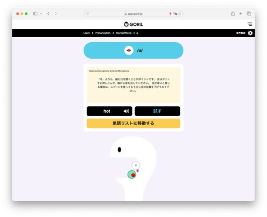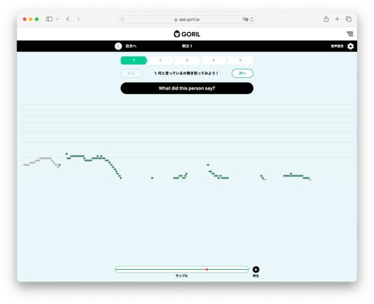 「GORIL」は、語+ドリルから名付けられた、どんな人でも、楽しく使える全く新しいタイプの発音学習ツールです。音声を科学的に分析し、可視化して、再現可能な一種の運動とすることで、楽しく発音を身に着けることができるツールです。
