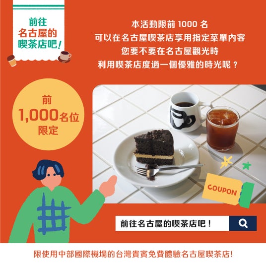 中部国際空港を利用する台湾人のお客様限定で、名古屋の喫茶店を体験できるクーポンを配布します。