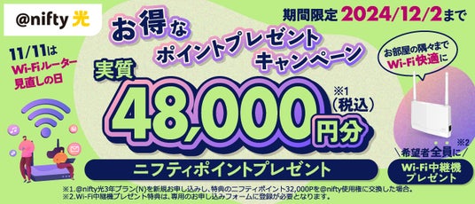 ニフティ、「@nifty光 3年プラン」の新規申込で48,000円分(税込)のニフティポイントに加え、希望者全員にWi-Fi中継機をプレゼント