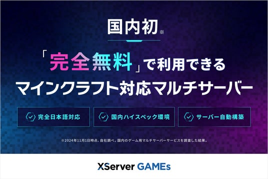 エックスサーバー株式会社(所在地:大阪市北区、代表取締役 小林 尚希)は、2024年11月1日、サーバーの知識不要で簡単にマルチプレイが楽しめるゲームサーバー専用サービス『XServer GAMEs』において、国内初(※1)となる、マインクラフトの統合版・Java版に対応した《完全無料》のマルチプレイサーバーの提供を開始しました。今後、無料マルチプレイサーバーの対応ゲームは順次拡大を予定しています。