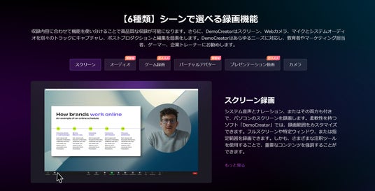 Wondershare DemoCreator(ワンダーシェアーデモクリエイター)は、誰でも簡単に画面録画と編集ができるPC向け画面録画・編集ソフトです。PC画面を使って行うデモや、チュートリアル、プレゼンテーションなどのビジネスシーンから、オンラインゲームの実況配信、オンライン学習教材など、動画作成の知識がない方でも幅広くお使いいただけます。