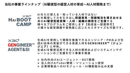 AI特化型エンジニアと生成AIを活用した次世代エンジニア(GENGINEER(TM))の育成・供給を通じて、国内有数のAI導入支援企業として、多くの企業のAI事業進出とAI人材育成を支援してまいります。親会社x3dのAI人材育成ノウハウと、高度な開発体制を組み合わせることで、企業のAIトランスフォーメーションを包括的に支援いたします。