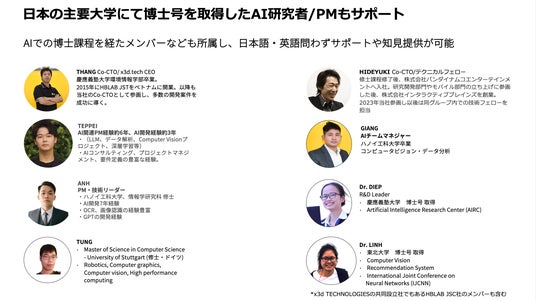 このような状況に対応するため、当社は株式会社ワンオブゼム時代から培ってきたベトナム・ハノイでの技術者育成ノウハウを活かし、現地の優秀なAI人材を積極的に登用。日本の大学で博士号を取得したAI研究者を含む高度技術者チームと、日本国内のAI人材育成の知見を組み合わせることで、包括的なAIソリューションを提供することを目的に、新会社を設立いたしました。