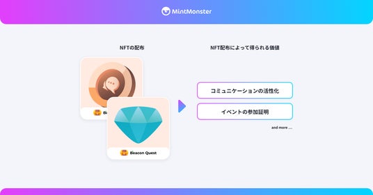 「MintMonster」は企業によるNFTのビジネス活用を、簡単かつ迅速に実現するプラットフォームです。NFTを簡単に配布・受取できることはもちろん、NFTを活用するための多彩な機能や、施策の詳細な効果測定ができる管理機能により、NFTのビジネス活用の成果を最大化します。ファンマーケティング、地方創生・地域活性化、店舗マーケティング、社内マーケティングなど、さまざまな場面でご活用いただけます。