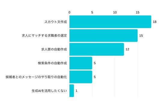 具体的な用途では、「スカウト文の作成」(18社)や「求人にマッチする求職者の選定」(15社)が主要な活用分野として挙げられました。これらの分野で、ダイレクトリクルーティングの工数削減や効率化を図りたい企業が多いことがわかります。
