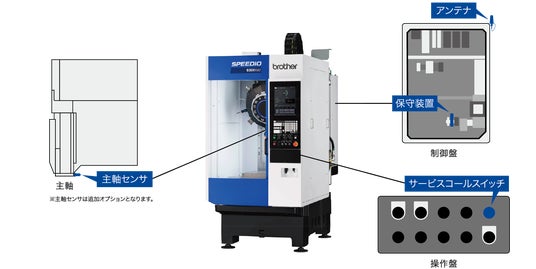 遠隔サポートキットは、制御盤内に「保守装置」、「アンテナ」、機械操作パネルに「サービスコールスイッチ」を設置。設置直後に接続でき、サービスを開始できる。また、追加オプションで、主軸の振動を監視する「主軸センサ」も用意されている。