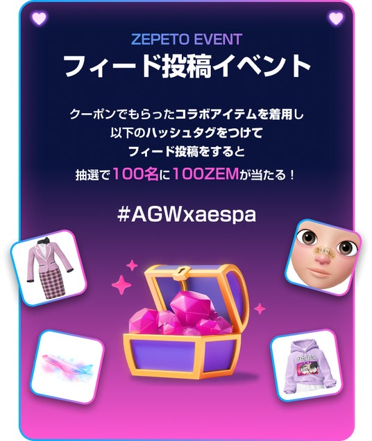 1.のキャンペーンで獲得したZEPETO内aespa限定アイテムを身につけて、#AGW×aespaを付けてZEPETO内でフィードを投稿した方の中から抽選で100名様に100ZEMをプレゼント!