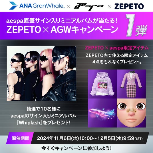 NAVER Z Corporation(本社:韓国、代表:キム・チャンウク、以下NAVER Z)は、ANA NEO 株式会社(本社:東京都港区、代表取締役社長:冨田 光欧、以下「ANA NEO」)と連携し、11月6日(水)よりソーシャルプラットフォーム『ZEPETO』およびスマートフォン向けバーチャル旅行プラットフォームアプリ『ANA GranWhale』(以下、AGW)にて、大人気K-POPグループaespaとのコラボレーションイベントを開催することをお知らせします。