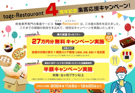 飲食業界専門の集客サービス tagz-Restaurant4周年記念 集客応援キャンペーンをスタート!