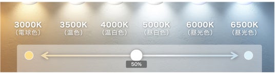明るさは1%刻みで調整でき、色温度も電球色(3,000K)~昼光色(6,500K)まで調整が可能です。また、常夜灯も5段階で調整でき、シーンや好みに応じた光のコントロールにより、心地よい住空間を演出できます。