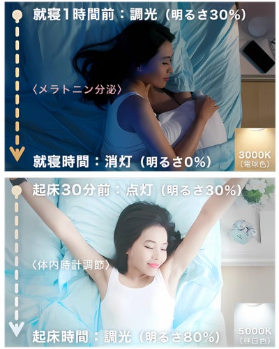 「おはようルール設定」では、起床時間に合わせて自然光のような優しい光が点灯し、少しずつ明るさを変化させ、体内時計を調節しながら自然な目覚めをサポートします。