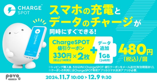 KDDI、沖縄セルラーは2024年11月7日から、povo2.0の期間限定トッピングとして、「ChargeSPOT 2時間分」(330円/1時間分の値引きクーポン×2枚)とpovo2.0の「データ追加1GB(24時間)」がセットになったトッピングを480円で提供します。