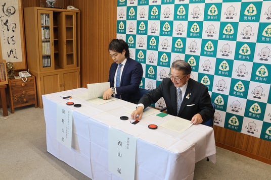 ネットランド 代表取締役社長 岡野太郎(左)、西山猛 更別村村長