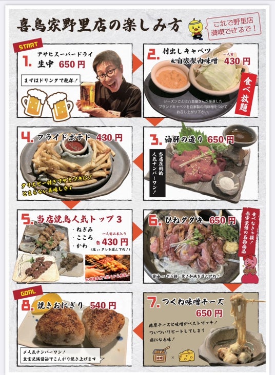 「ダイニーPOSレジ」で集計した商品分析データをもとに、粗利構成比が高いメニューとリピーター率が高いメニューを組み合わせた「喜鳥家の楽しみ方」という指南書を各テーブルに用意して案内しました。結果、リピーター売上比率の24%に大きく貢献しました。