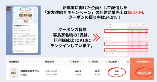 会食が増えるシーズンの3月に喜鳥家を思い出してもらい、常連さまが馴染みの店としてご新規の方を紹介してもらえるように、「お友達紹介キャンペーン」と銘打ってクーポンを配信。結果、1配信で850万円の配信売上効果、クーポン戻り率14.9%を達成をしました。