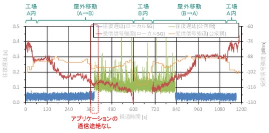 赤線:ローカル5G経由の受信信号強度、オレンジ線:公衆網経由の受信信号強度