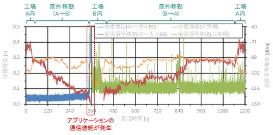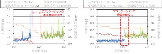 青線:ローカル5G経由の往復遅延、緑線:公衆網経由の往復遅延