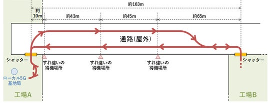 今回、図4のような環境で実験を行った。工場Aの中にローカル5Gの基地局を設置し、SRF Deviceを搭載した自動搬送車は工場Aと工場Bの間を往復している。工場Aと工場Bのシャッター(自動搬送車の出入口)は約163m離れており、その間は屋外の通路となっている。自動搬送車は図4の矢印の方向に移動し、渋滞しないように通路の途中3か所にすれ違いの待機場所が存在している。すれ違いの待機場所では、双方向の自動搬送車が揃うまで、先に到着した自動搬送車は待機する。