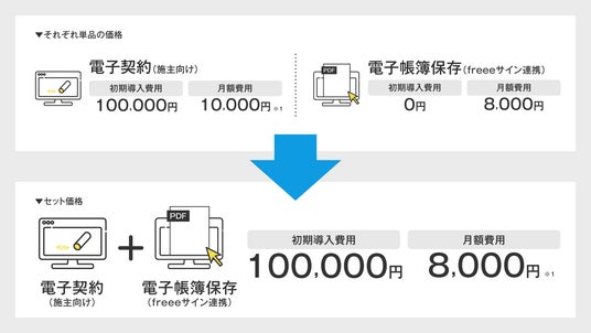「電子契約オプション」は「電子帳簿保存法オプション」とセット契約で、単体でのオプション契約よりも月額利用料が割安になります。