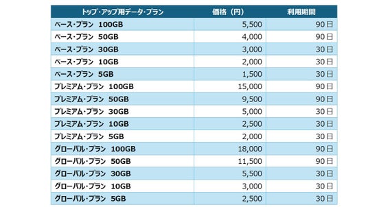 - トップ・アップ用プランには、日本に加えて韓国、台湾、タイ、ベトナムでの利用が可能な「ベーシック・プラン」、日本及び海外主要40ヶ国余で利用可能な「プレミアム・プラン」並びに世界140ヶ国余で利用可能な「グローバル・プラン」の3種類があり、容量も選択できます。(ベーシック・プランは、購入時初期データ・プランと異なり、アメリカでは利用できませんので、ご注意ください。)