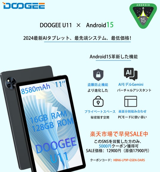 最安値挑戦、Android15タブレット DOOGEE U11、楽天市場で早売SALE!SNS限定5000円オフで12900円!16GB+128GBストレージ+8580mAh大容量バッテリー