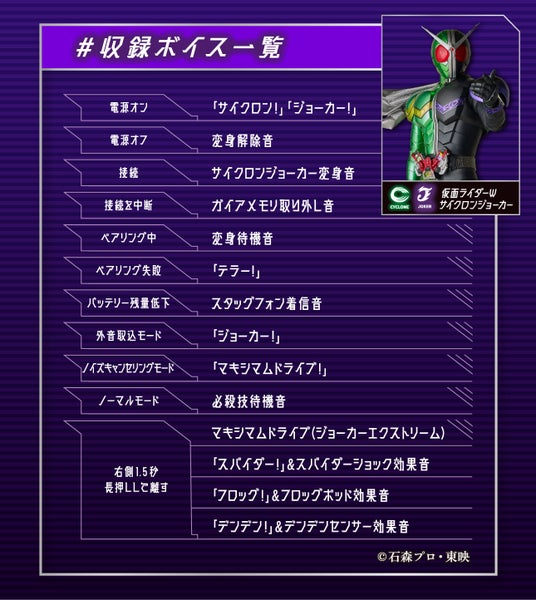 電源ON/OFFなどをお知らせするボイスガイダンスには、株式会社バンダイの全面協力によりダブルドライバーやロストドライバー、ガイアメモリなどの音声を約140種類搭載。