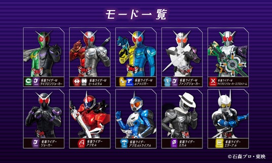 また、アプリで切り替え可能な、5ライダー、10フォームを再現したモードを搭載。「仮面ライダーW サイクロンジョーカー」「仮面ライダーW ヒートメタル」「仮面ライダーW ルナトリガー」「仮面ライダーW ファングジョーカー」「仮面ライダーW サイクロンジョーカーエクストリーム」「仮面ライダージョーカー」「仮面ライダーアクセル」「仮面ライダーアクセルトライアル」「仮面ライダースカル」「仮面ライダーエターナル」の10モードをお楽しみ頂けます。