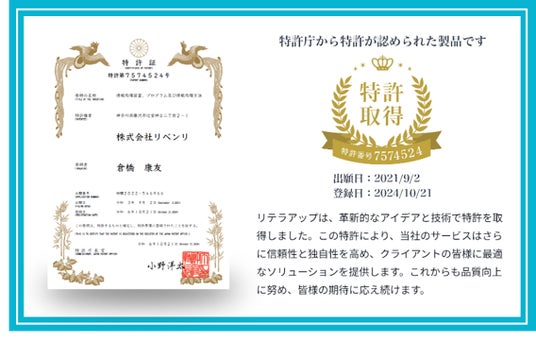 株式会社リベンリ(本社:神奈川県藤沢市、代表取締役:倉橋康友)は、弊社の提供する「リテラアップ」が技術特許を取得したことをお知らせいたします。