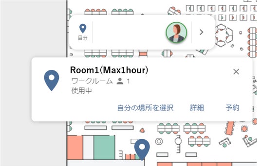 <「勤務状況の共有」機能 画面イメージ>「自分の場所を選択」または「予約」をすることで、自分の位置を共有できる