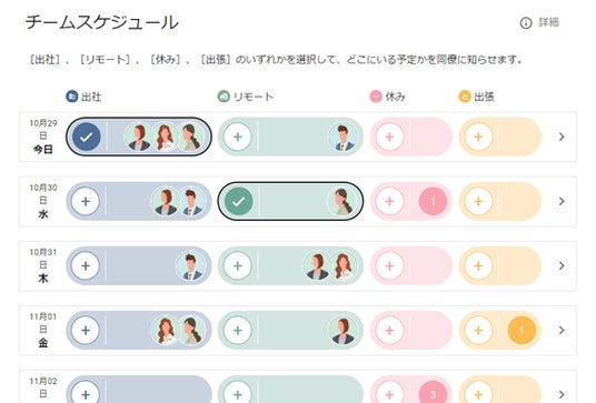 従来、出社予定の共有のみであった機能をアップデートし、「Office(出社)」「Remote(リモート)」「Travel(出張)」「Not working(休み)」の4つから働く場所を設定することが可能となります。