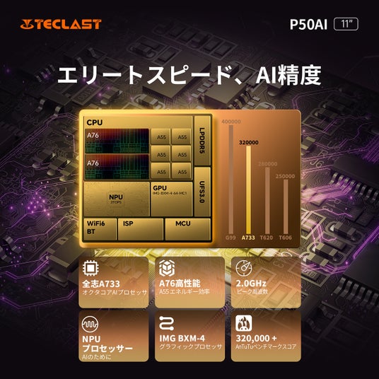Allwinner A733オクタコアAIプロセッサーを搭載したTeclast P50AIは32万を超えるAnTuTuベンチマークスコアでエリートレベルのパフォーマンスを実現します。A76高性能コアとA55電力効率コアに加え、AIタスク用の3TOPS NPUを搭載し、すべてのアプリケーションでスムーズで応答性の高いインテリジェントな動作を保証します。