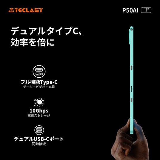 Teclast P50AIは、同時に使用できる2つのType-Cポートが搭載されています。プライマリポートは、10Gbpsデータ転送、DisplayPort HDビデオ・オーディオ出力、USB-PD充電、外付けUSBハブなどに対応します。