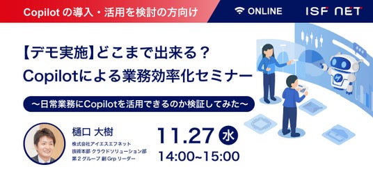 アイエスエフネット、11/27(水)14時より「【デモ実施】どこまで出来る?Copilotによる業務効率化セミナー~日常業務にCopilotを活用できるのか検証してみた~」セミナーを開催