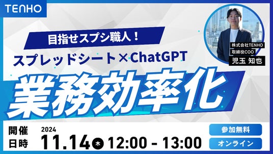 株式会社TENHO(本社:東京都渋谷区、代表取締役:田村 允)は、2024年11月14日(木)に第7回無料ウェビナー「【目指せスプシ職人!】スプレッドシートとChatGPTを連携させた業務自動化」を開催いたします。本ウェビナーでは、生成AIとスプレッドシートの連携により、業務効率化を図るための具体的な方法と実践的なハンズオンを提供します。