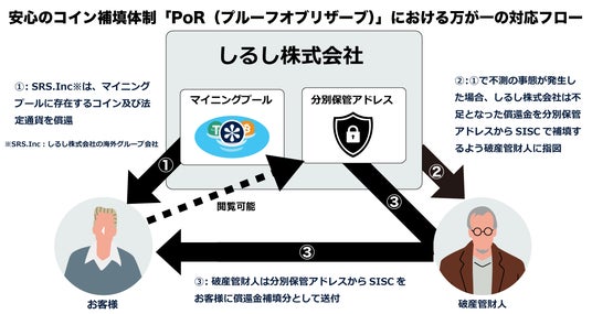 万が一、SRS Inc.がマイニングプールからの償還を行う際に不足分が発生した場合は、当社グループが保有しているしるしコイン(以下、SISC)を分別保管しているアドレスから、不足分をお客様に補填するよう、裁判所が選定した破産管財人に適切な指示を行います。破産管財人は、しるし株式会社からの指示に基づき、分別保管アドレスに保管してあるSISCを、不足が発生したお客様に対して確実に償還金補填分を送付する手続きを実行いたします。