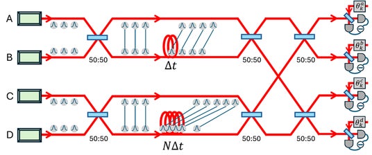 A、B、C、Dは光パラメトリック増幅器を表す。このデバイスから、量子揺らぎが圧搾された光(スクイーズド光)が出射される。これを時間Δtで区切り、光パルスとして扱う。二つの光パルスが50%反射ビームスプリッター(青の長方形)で重ね合わされると、A-B間、C-D間にそれぞれ2者間量子もつれが次々と生成される。その後、Bの光路では光パルス一つ分(Δt)、Dの光路では光パルスN個分(NΔt)をそれぞれ遅延させる。その結果、2者間量子もつれが異なる時間に分配される。これを複数の50%反射ビームスプリッターで重ね合わせてから測定することで、テレポーテーションベースの量子操作が実行される。量子操作に応じて、光パルスごと(kはパルスの番号)に測定基底を変更する。