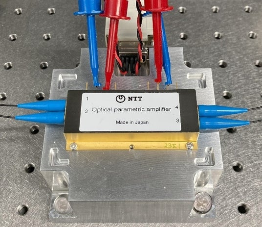 (左)NTT先端集積デバイス研究所作製の光パラメトリック増幅器。