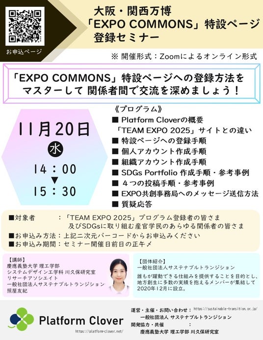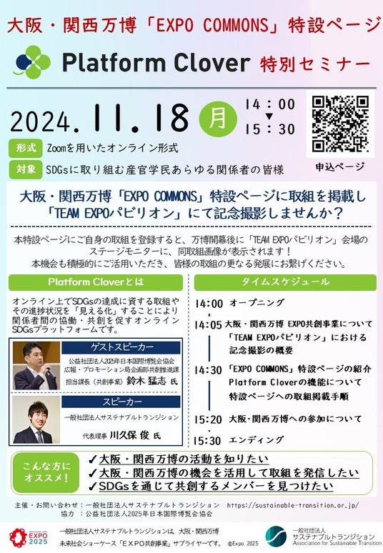 一般社団法人サステナブルトランジションが開発・運用を行う、持続可能な社会の構築を促すオンラインSDGsプラットフォーム「Platform Clover」では、2025年日本国際博覧会(以下、「大阪・関西万博」という)専用の特設サイト『大阪・関西万博「EXPO COMMONS」特設ページ』(以下、「特設ページ」という)を開設、運用しています。