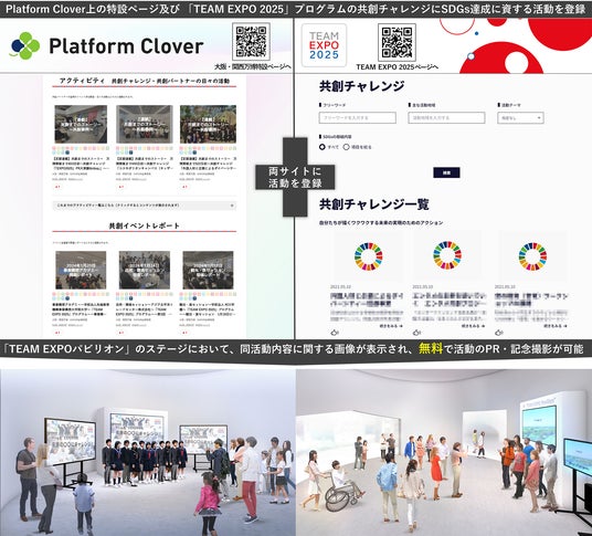 今回、本特設ページ及び「TEAM EXPO 2025」プログラムの共創チャレンジにSDGs達成に資する活動を登録いただくと、大阪・関西万博開幕後に会場のフューチャーライフヴィレッジ内「TEAM EXPOパビリオン」のステージにおいて、同活動内容に関する画像が表示され、大阪・関西万博参加者へ向けてご自身の活動をPRしたり、記念撮影が行えることとなりました。