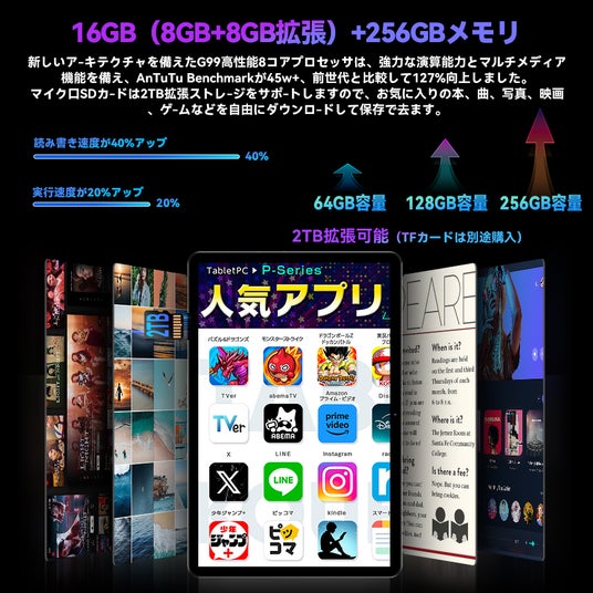 8GBの高速 RAMを搭載し、さらに8GBの拡張が可能なため、合計16GBという驚異的な容量で、Apad2の広い世界を思う存分に楽しめます。256GBの高速オンボード・ストレージを搭載し、Micro SD経由で最大2TBまで拡張できる柔軟性を備えているため、日常のあらゆるニーズに十分な容量を確保できます。
