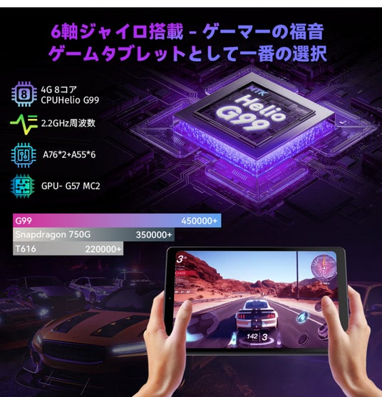 8コアHelio G99プロセッサを搭載したAlphawolf APad2は、2.2GHzで動作する2つの高性能A76コアと、6つの電力効率に優れたA55コアの組み合わせにより、生産性から娯楽まで、すべてのタスクで優れたパフォーマンスを保証します。ANTUTUスコア450000+を達成し、T606に比べ 50%-80%という驚異的な性能向上により、高性能ゲームに最適で、あらゆるゲームニーズに対応可能です。