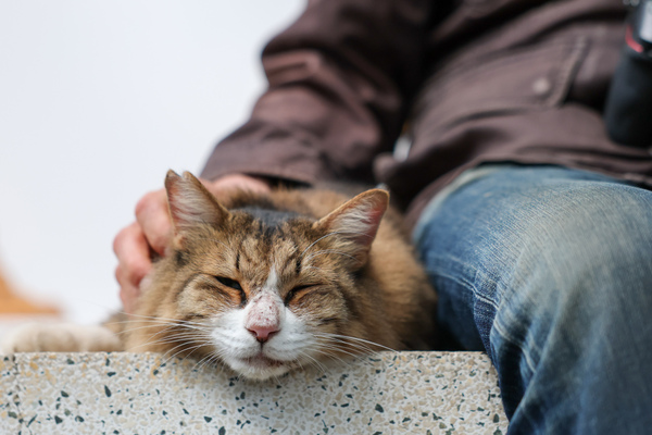 次の写真は、猫を世話してる人。人も猫もリラックスしてるのがよくわかる。
