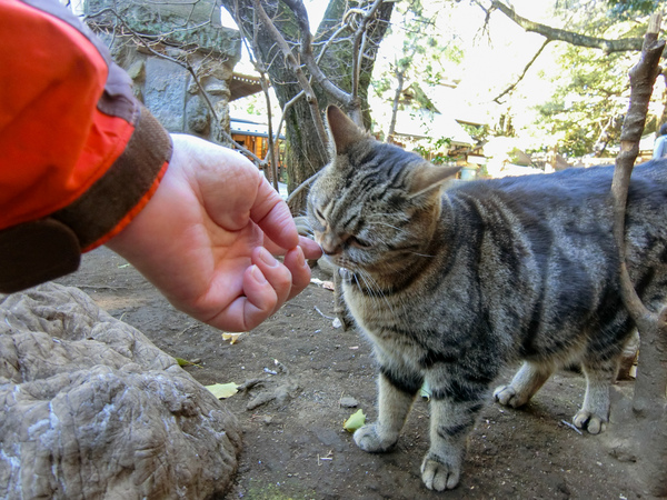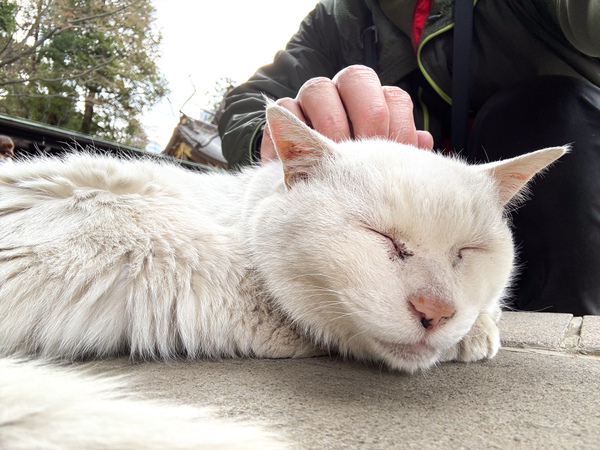 冒頭写真は、都会のとある神社にいる名物猫。かなりの老齢でおとなしい。撫でられるのが好きってわけじゃないけど、いつも人が行き来する場所で昼寝してる。それを見つけて、そーっと触ろうとしてる手が何だかいじらしい。寺社に住みついてて、中の人が世話してる猫はたいてい人に慣れてるので、こういう光景に出くわすのだ。