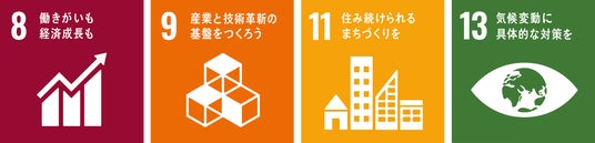 今回の取組は、SDGsの17のゴールのうち、特に8,9,11,13番に貢献するものと考えています。