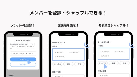 「シンプル Good & New」では、参加するメンバーを登録し、発表順を表示できます。