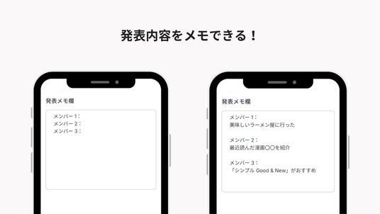 発表順に通りにメンバーの名前が自動で記入されるので、スムーズにメモを取ることができます。