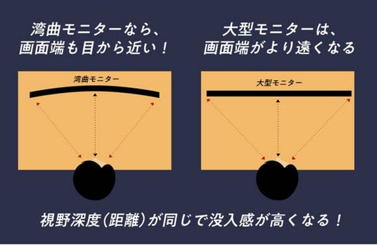 曲率1800Rは画面全体が見やすくなっています。高い没入感はもちろん、目のピント調整を最小限で全体を把握できるので、目の負担を軽減できます。画面の中央と端で距離差が少なく、ピント調整を最小限に、没入感が高くなります。