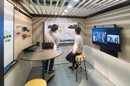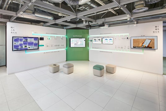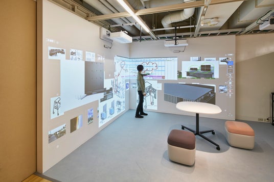 コンテンツ表示アプリ「Realsize Presenter」やL型大スクリーンの装備により、R&D業務のミーティングで計測データや等倍表示の図面などの様々な資料を複数同時に表示することが可能です。スクリーン全面を電子黒板化し、画面操作や書き込みも可能です。チームメンバーがすぐに集まり、新たな発想を交換するブレインストーミングや、創出したアイデアや技術の実現可能性の検討など、様々なR&Dのチーム活動を支援します。