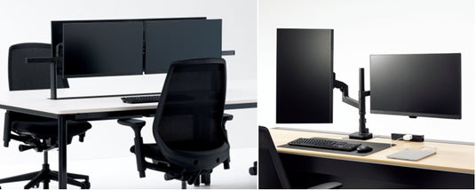 複数モニター使用時、対面レイアウト時、自由度の高い強固なモニタービームとアーム。自由な動きで、快適な位置で個人作業を進められ、また、大型モニターでの資料共有などのミーティングにも利用できます。「Commons Table System-i」や「Arcena」など、フレキシブルな働き方を実現する製品に取り付けられるよう設計されたアタッチメントにより、広く整理された机上を維持することができます。