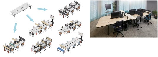 また成長する日本市場に向けた新製品「CO-Creation(仮称)」を初公開します。これは様々な部署や働き方の特性に寄り添える、状況に応じて変化ができるワークデスクです。フラットな基本体に、様々なパーツを付加していくことで職種に合った個人ワークの環境に調整でき、またハイカウンターによる立ち姿勢での作業やコミュニケーションもとることができます。
